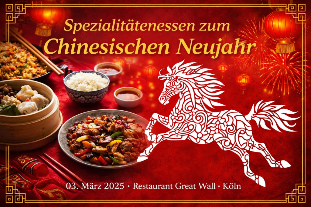 Wir laden Euch herzlich zu einem festlichen Abend mit authentischer chinesischer Küche ein. Freut Euch auf kulinarische Spezialitäten in geselliger Atmosphäre und einen genussvollen gemeinsamen Start in das Jahr des Pferdes.